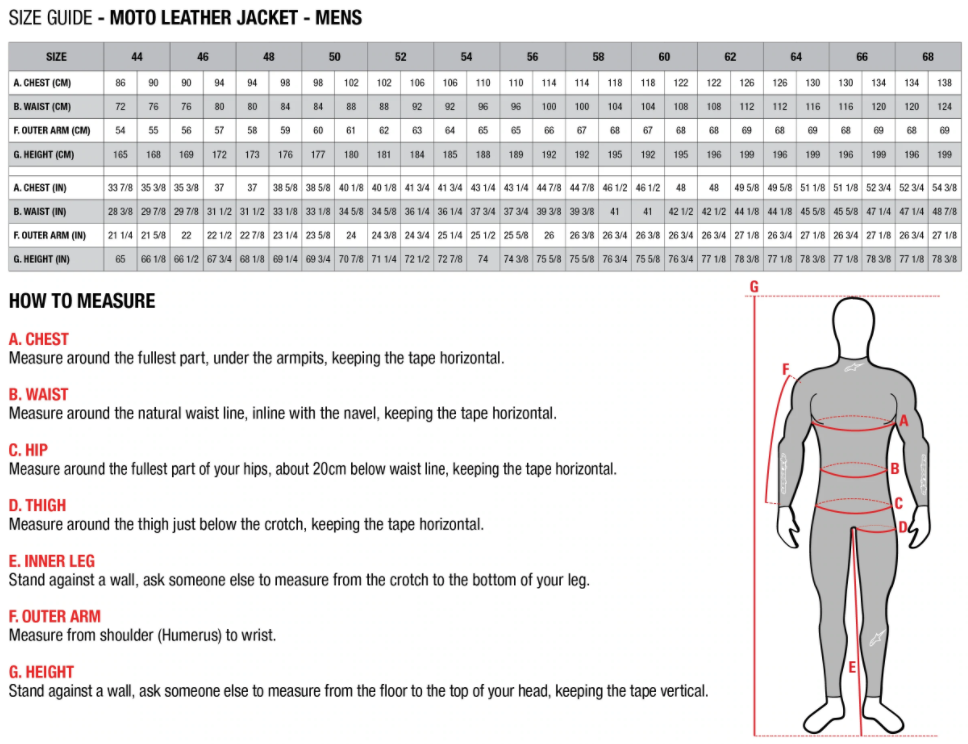 Alpinestars Leather Jacket Sizing Chart