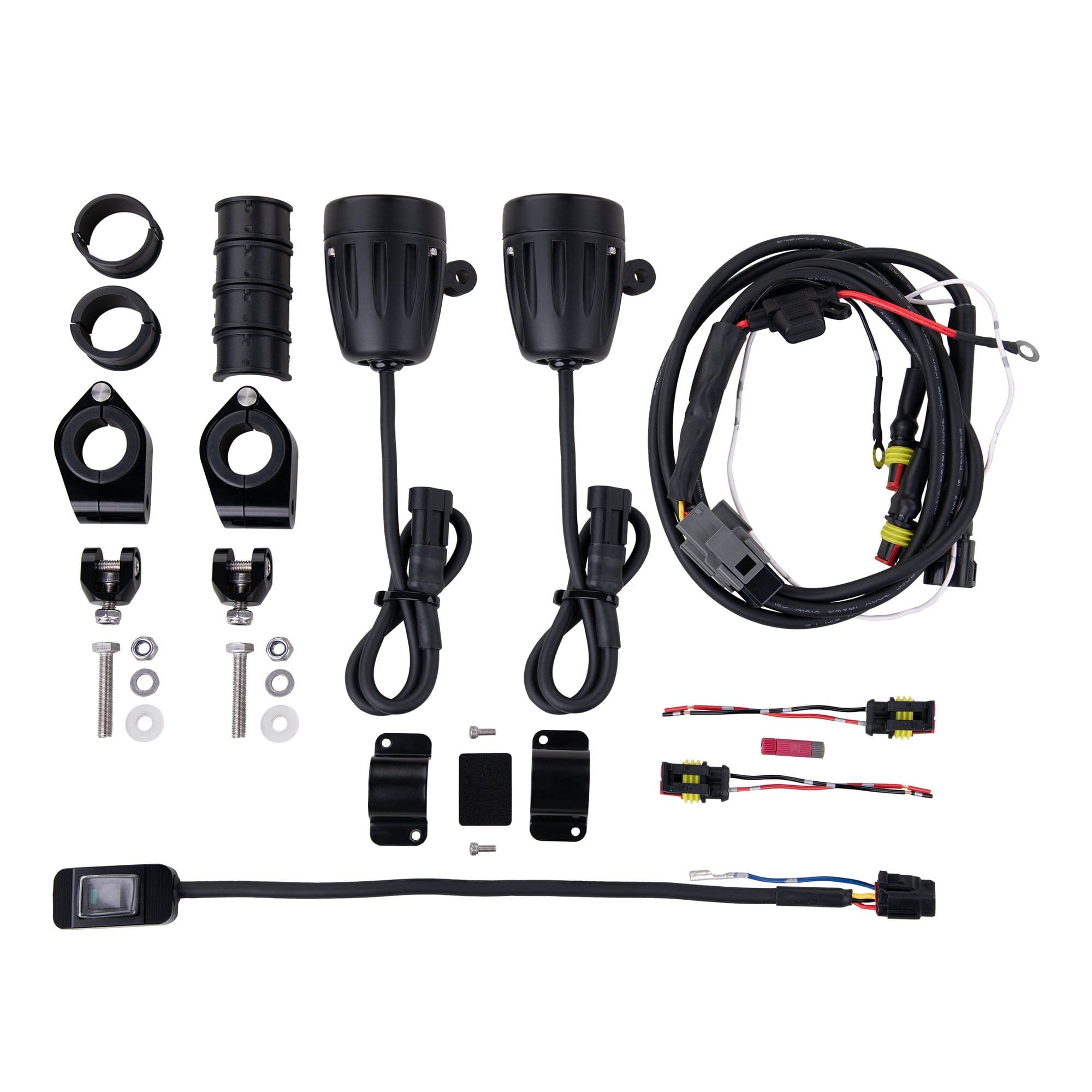 Includes: 2 x Auxiliary Lights, 2 x Auxiliary Light adaptors, 2 x mounting brackets (for 22-28mm⌀ bars), 1 x wiring harness, 1 x On/Off switch